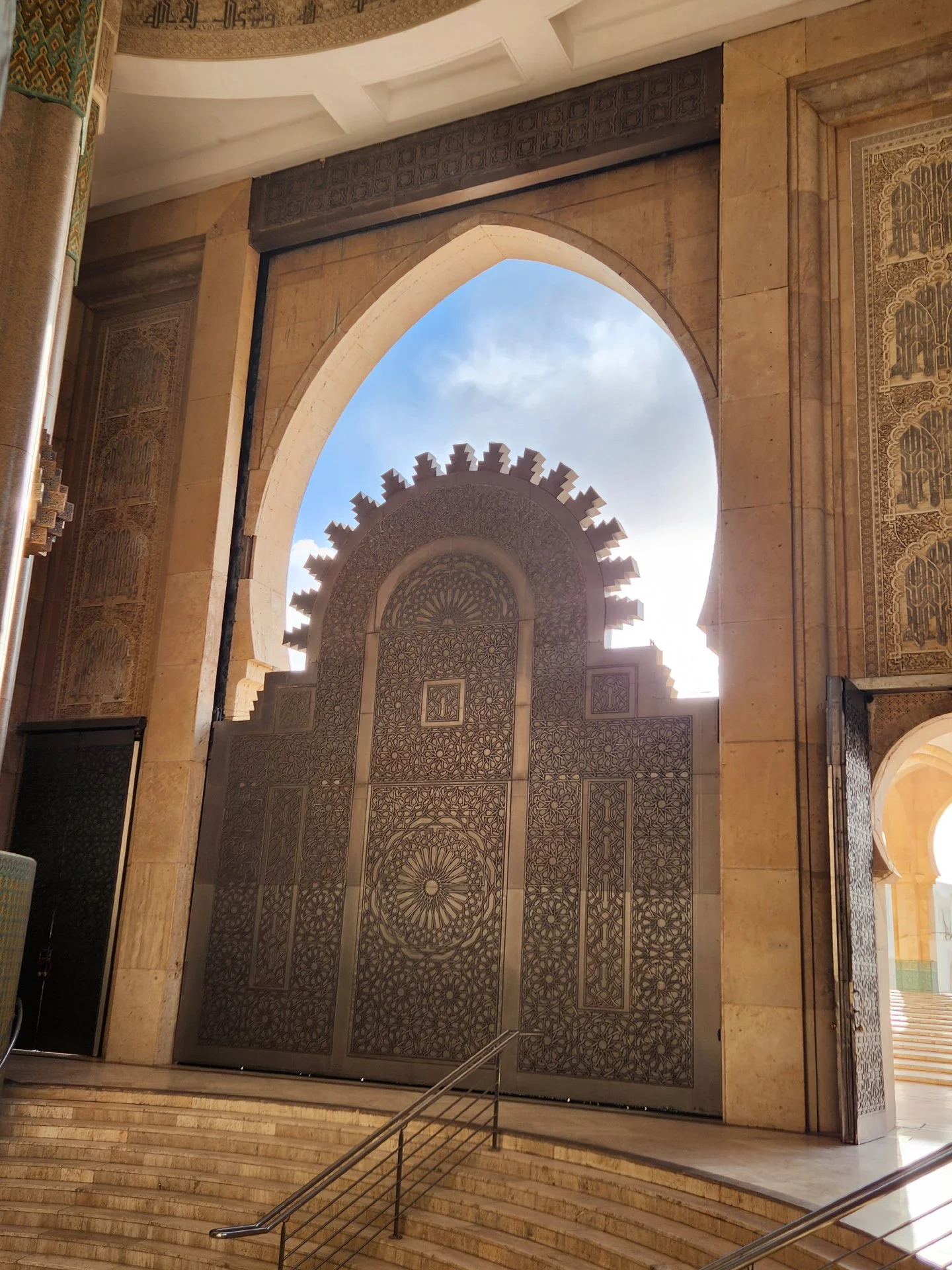 Earlier in the day, we visited the Hassan II mosque. Our timing yielded perfect morning light after a day of rain as well as minimal numbers of fellow tourists, who tend to arrive in droves. It was a memorable experience. A recent addition to the Casablanca skyline, the mosque stands on a promontory overlooking over the adjacent Atlantic Ocean. It was built in just six years from 1987 to 1993 by the son of Mohammed V, King Hassan II (1929-1999) who reigned over Morocco from 1961 until his death. He wanted to build the farther-west mosque in the African Arab world in order to incorporate the elements of not only land and air, but also water. Thus, part of the mosque’s foundation lies deeply embedded in the ocean water.