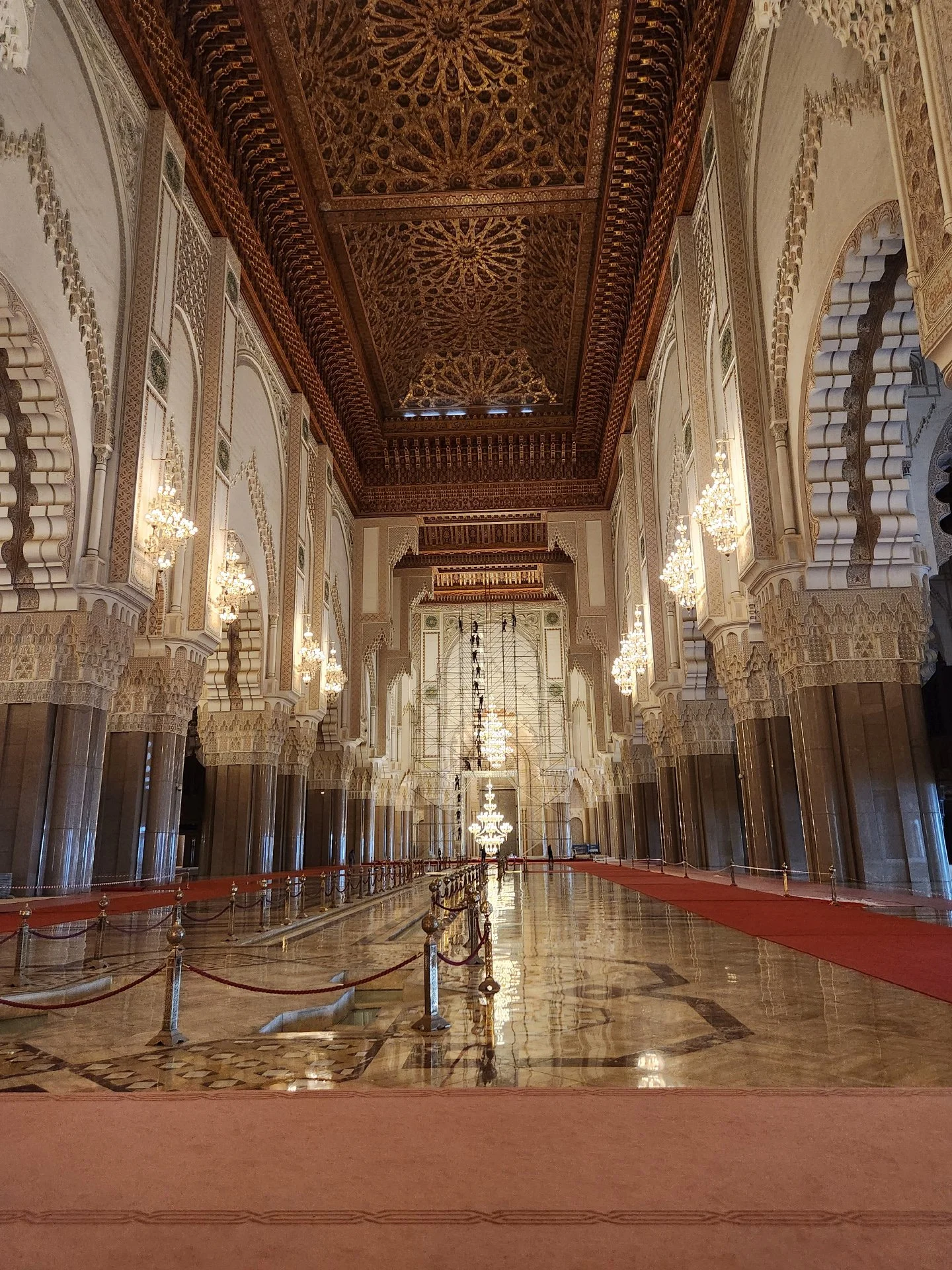 Among the largest mosques in the world, Hassan II mosque is deeply Moroccan. It was built and decorated by Moroccan builders and craftspeople using carved plaster, ornate tile designs (known as “zellige” which is different from mosaic), and carved cedar. The work was painstaking. For example, we were told that it took craftsmen four to five days to carve each square meter. Source materials were almost entirely Moroccan except the 56 chandeliers. The cost of construction—about US$700 million— was largely by public donation. Twelve million people stepped up to give. Each received a receipt and certificate, even the smallest donors of just 5 dirham (about fifty US cents).